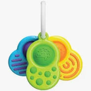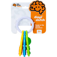 Set of 3 sensory clutches on a large key ring, each featuring a dimpl bubble and unique textures—bumps, circles, and lines—for little hands to explore. Chunky design encourages fine motor skills and sensory learning. Made from high-quality ABS plastic and food-grade silicone. Each measures 3.75 x 2.25 inches. Ages 0 months+.